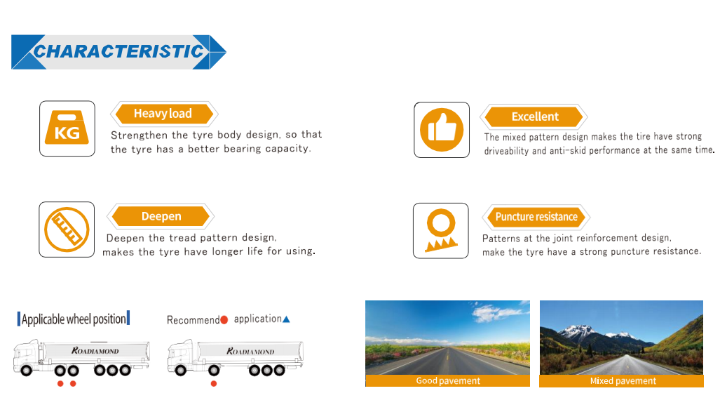 Apply for driving wheel position tires on good pavement or mixed pavement for medium and short distance standard load trucks.