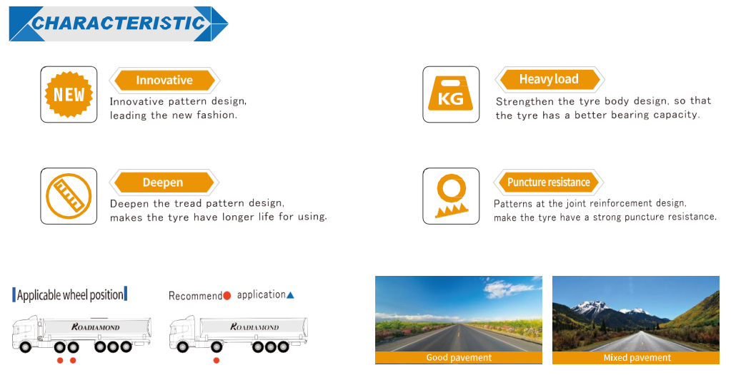 Apply for driving wheel position tires on good pavement or mix pavement for medium and short distance standard load trucks
