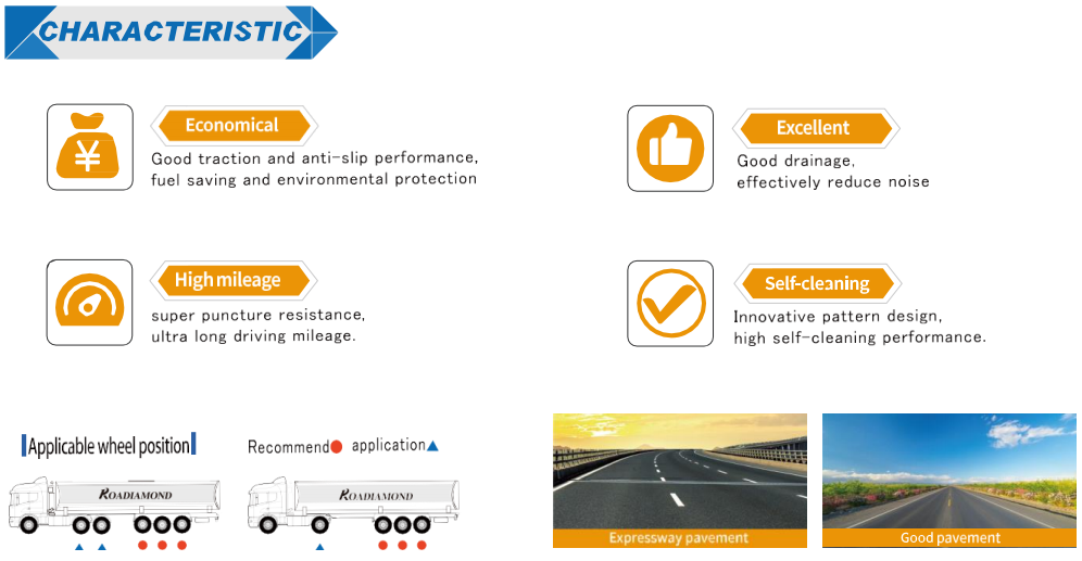 Apply for trailer wheel position tires on expressway or good pavement for medium and long distance standard load trucks.